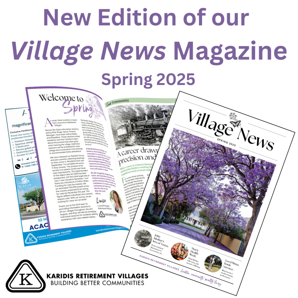 The 14th edition newsletter is out now. The “Village News” is a celebration of the community spirit at Karidis Retirement Villages. We hope you enjoy the virtual read, click on the PDF viewer below. If you would like a free copy posted to you, please email us: salespa@karidis.com.au